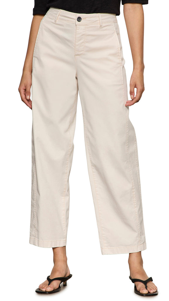 High Rise relaxed leg pant. Button front and zip fly closure.