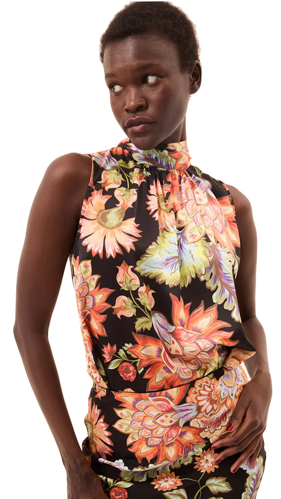 The sleeveless Luka top is an easy high-neck silhouette cut from a stunning Fiery Flora print satin. Featuring a self-tie at the neckline, this versatile style can be paired with a wide leg trousers under an oversized blazer.